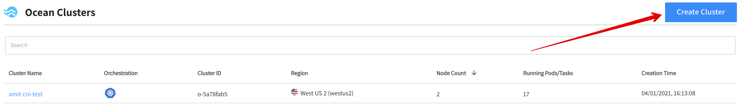 In the left menu of the Spot console, click Ocean/Cloud Clusters, and click Create Cluster.