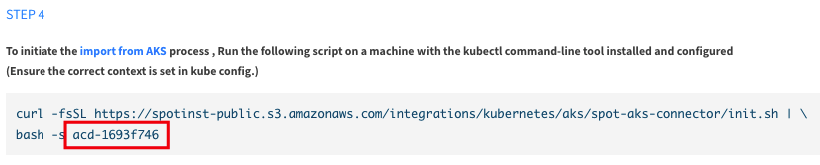 This procedure runs a job in the AKS cluster that imports the configurations required for creating an Ocean cluster. The job creates a record in the Spot database with the specified SPOT_ACD_IDENTIFIER. That record is used later for creation of the Ocean cluster.